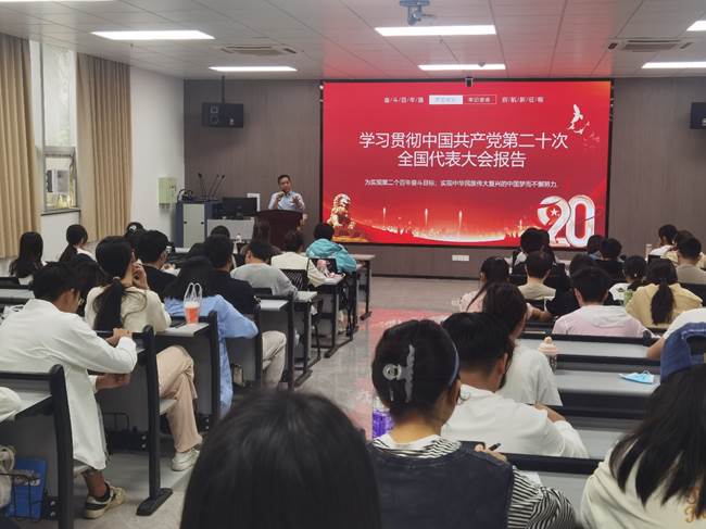 推动学习全覆盖。将党的二十大精神纳入院党委会第一议题及时跟进学习,作为理论学习中心组重点内容开展专题研讨。把学习贯彻习近平新时代中国特色社会主义思想和党的二十大精神作为党组织理论学习“第一内容”、党员学习“第一任务”,贯穿党支部“三会一课”等党员日常教育全过程。在学生中积极开展学习活动,利用主题班会、主题党日团日活动等学习形式,推动学习全覆盖。