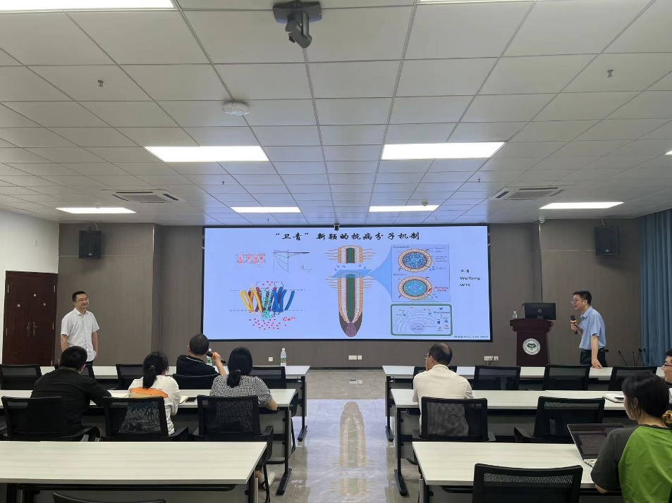 会上,陈宇航研究员介绍了“ZAR1抗病小体离子通道”“SR35抗病小体离子通道”和“新型抗病离子通道WeiTsing(卫青)”等多个植物抗病钙离子通道的结构和作用机制。陈宇航研究员与合作团队首次发现激活后的五聚体抗病蛋白ZAR1具有钙离子通道活性,可以引起钙离子内流,并通过钙信号来激发植物免疫应答。而抗病小体Sr35激活之后也可以形成五聚体结构的钙离子通道来激发免疫和抗病过程。他们最新的研究成功克隆了广谱高抗根肿病基因“卫青”,发现该抗病蛋白同样形成五聚体结构的钙离子通道,通过激活胞内钙信号来触发免疫反应。报告结束后,参会师生就植物抗病免疫、钙信号和膜蛋白结构等相关内容和陈宇航研究员进行了热烈讨论。