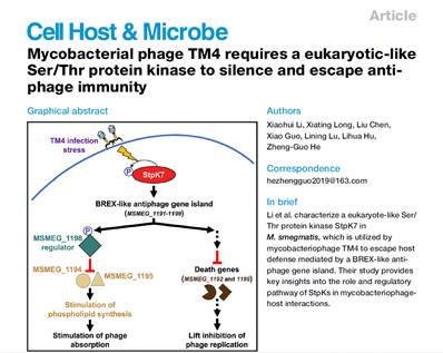已有的研究表明,丝氨酸/苏氨酸激酶(StpK)广泛存在于真核生物和细菌中,通常发挥抗病毒的作用。有趣的是,何正国团队发现分枝杆菌噬菌体TM4能够利用细菌中的StpK逃逸宿主的防御,因此定义了第一个噬菌体宿主因子蛋白激酶,同时在分枝杆菌中鉴定了第一个该类激酶调控的抗噬菌体防御基因岛。该研究表明,在噬菌体感染过程中,TM4显著诱导宿主分枝杆菌胞内StpK7的表达和磷酸化。活化的StpK7一方面通过磷酸化一个类BREX防御岛中的转录因子抑制其下游靶基因的表达,最终促进了磷脂合成和对噬菌体的吸附;另一方面,StpK7抑制了细菌细胞死亡基因的表达,从而抑制了宿主细菌的流产感染。这两方面的共同作用最终增强噬菌体的感染和复制能力,这些发现揭示了噬菌体-分枝杆菌之间独特的防御与反防御相互作用新机制,也为未来利用噬菌体防治相关感染性疾病提供了重要线索和新思路。