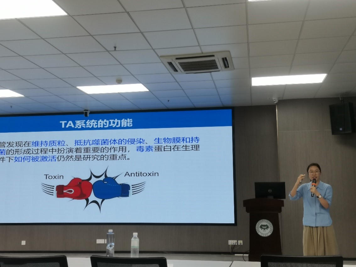 王晓雪研究员作了题为“原核生物的毒素/抗毒素系统的多样性与功能”的学术报告。在报告中,王晓雪研究员首先从TA系统的特点、功能以及分类等方面进行介绍,耐心讲解新TA系统的发现过程以及一系列的验证研究,让同学们对毒素和抗毒素系统有细致的了解,同时也深刻感悟TA系统的研究的意义,对大家探究不同科学问题的思维方式有新的启发。随后,王晓雪讲述了目前研究所发现的毒素与抗毒素的作用机制。