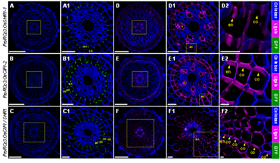 图1 OsCIF1、OsSHR1和OsCIF1/OsSHR1的过表达根中OsCASP1-GFP和木质素累积的横切面观察
