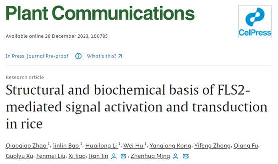 2023年12月28日,ylzz总站线路检测中心明振华团队和金健团队合作在Plant Communications在线发表了题为Structural and biochemical basis of FLS2-mediated signal activation and transduction in rice的研究论文。该论文解析了水稻中鞭毛受体激酶OsFLS2胞内激酶区的晶体结构,并提出了水稻OsFLS2通路的顺序激活模型。