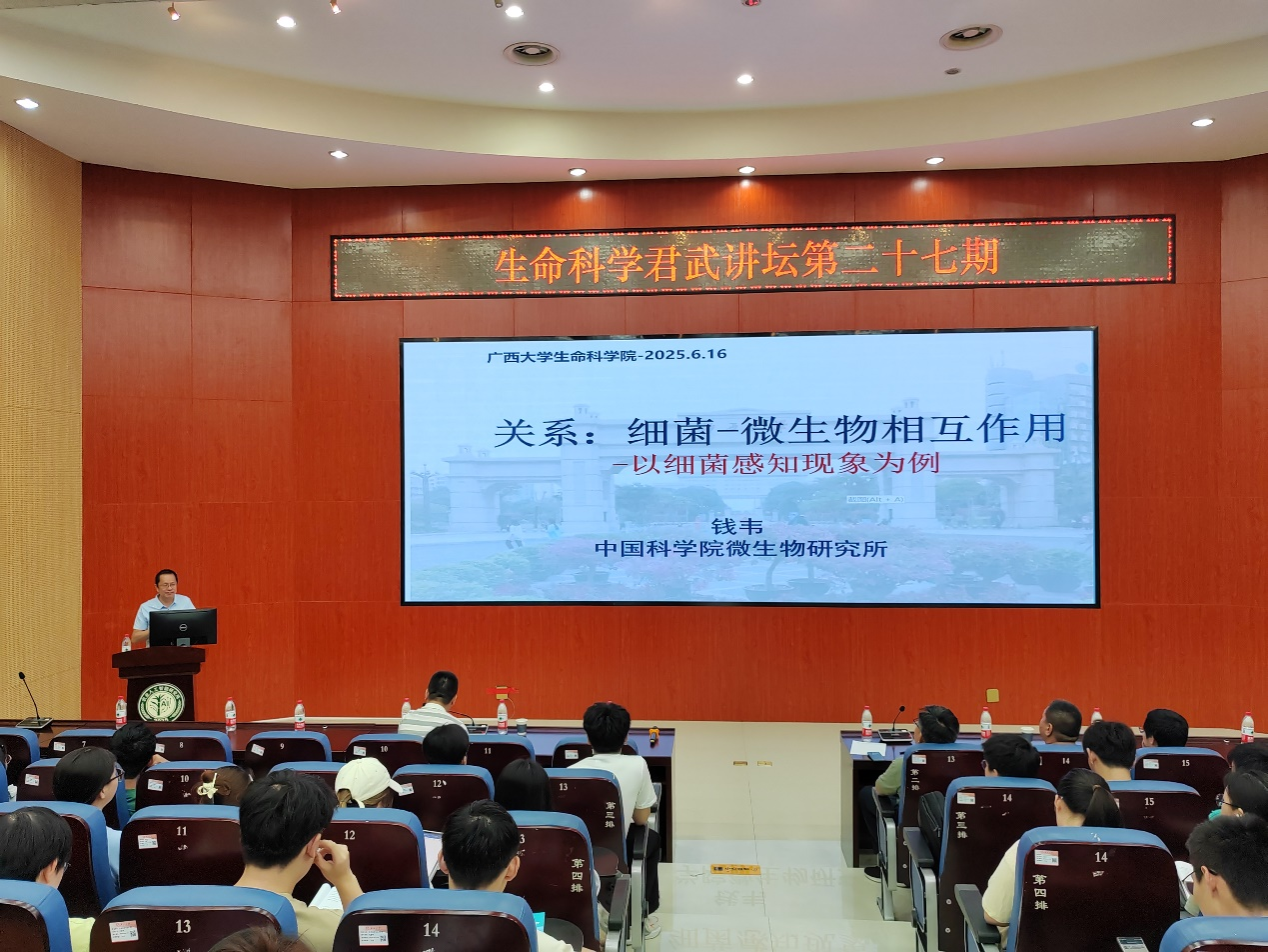 调研期间,钱韦研究员应邀做客第二十七期“生命科学君武讲坛”,作了题为“关系:细菌–微生物相互作用”的学术报告。报告会由李伟辉副院长主持,吸引了近200名师生参与。