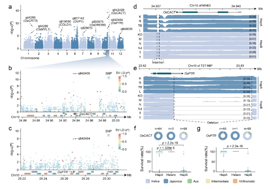 该研究以典型模式植物为对象,对10份具有温度适应多样性的水稻材料进行高质量基因组组装,并与已测序基因组整合,构建了图形泛基因组,绘制出覆盖30,316个多态性转座子的TIP图谱。进一步结合冷胁迫处理下的转录组和ChIP-seq、BS-seq等表观组数据,多态性转座子通过调控H3K27me3/H3K9me2组蛋白修饰及DNA甲基化重塑基因表达网络,介导植物冷胁迫响应(图1)。与传统SNP-GWAS相比,TIPs-GWAS方法对冷耐受性状的关联信号检测灵敏度显著提升,研究团队成功定位到两个关键耐冷基因(OsCACT和OsPTR),进一步通过CRISPR-Cas9基因编辑(敲除和过表达)及生理生化分析等实验验证其功能,邻近pTEs可能通过影响其表达水平或转录本结构,显著调控植株在低温胁迫下的存活率(图3)。