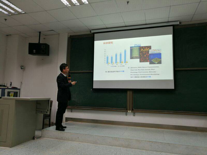 2018年12月14日,“南农名师西大行”专场学术报告会在生命科学与技术学院106教室成功举办。本场学术报告会由南京农业大学生命科学学院蒋建东、赵明文、强胜、崔瑾、崔中利等五位教授组成的“南农名师团”,为我院学生带来了各自最新的研究成果。本次报告会由学院党委副书记曾海艳老师主持,常务副院长李有志教授致辞。150余名师生聆听了报告会。