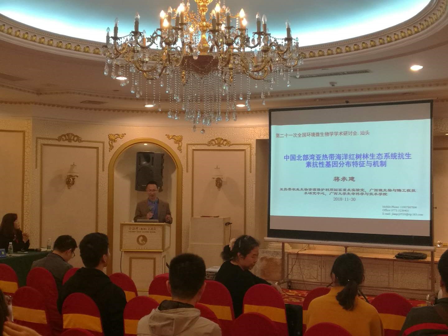 我院蒋承建教授受邀参会并做分会场主题报告“中国北部湾亚热带海洋红树林生态系统抗生素抗性基因分布特征与机制”。报告汇报时间20分钟。报告主要围绕基于宏基因组学高通量测序分析策略,分析了中国北部湾亚热带红树林区域新型抗生素抗性基因的丰度和多样性以及功能特征,明确了各种主要环境因子、可移动遗传元件和微生物功能群落对抗生素抗性基因分布的影响。同时揭示了北部湾亚热带典型红树林中ARG的流行情况和分布模式,对ARG在红树林湿地生态系统中的归趋提出了解释。相关研究成果突出了红树林湿地生态系统对新型环境污染物降解的重要性。大会报告得到了与会同行的良好反响。