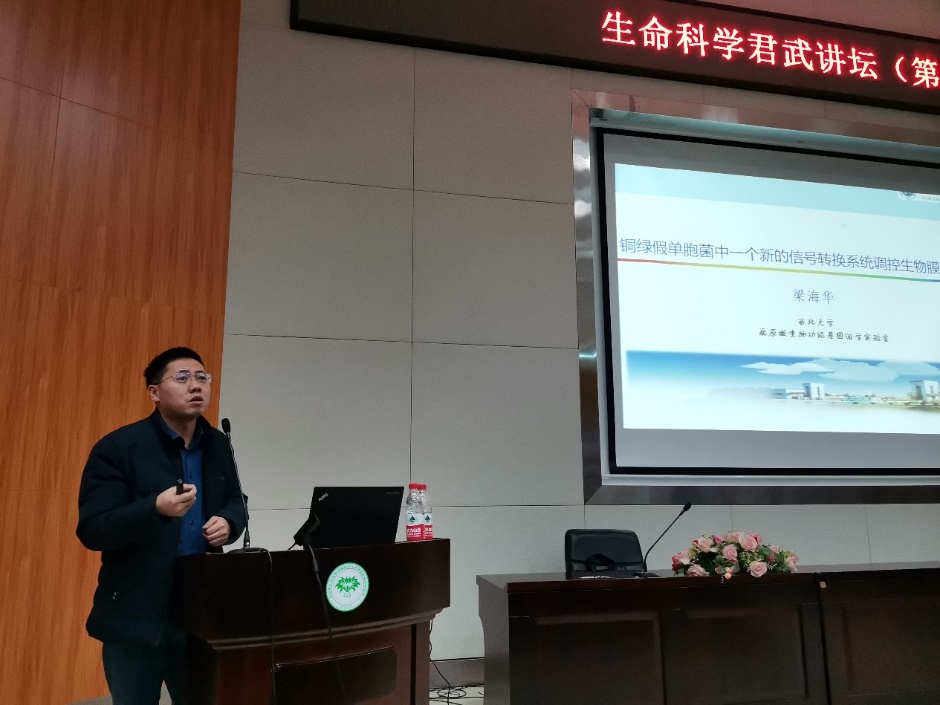 接下来梁海华教授做了题为《铜绿假单胞菌一个新的信号转换系统控制生物被膜的形成》的精彩报告。梁教授团队主要从事病原菌信号传递、致病性及耐药性机制的相关研究。他从多个方位展开了报告,包括群体感应系统和第二信使信号系统等,除此之外还为大家介绍了一个新的c-di-GMP信号受体-SiaD,其具有环化酶活性,处在siaABCD操纵子中。SiaA具有磷酸酶活性,SiaB具有激酶活性,这两种酶通过对SiaC的去磷酸化与磷酸化来调控SiaC与SiaD的结合,二者结合可以激活SiaD的环化酶活性,最终调节胞内c-di-GMP的浓度。该研究成果为开发抗菌药物提供了理论基础。