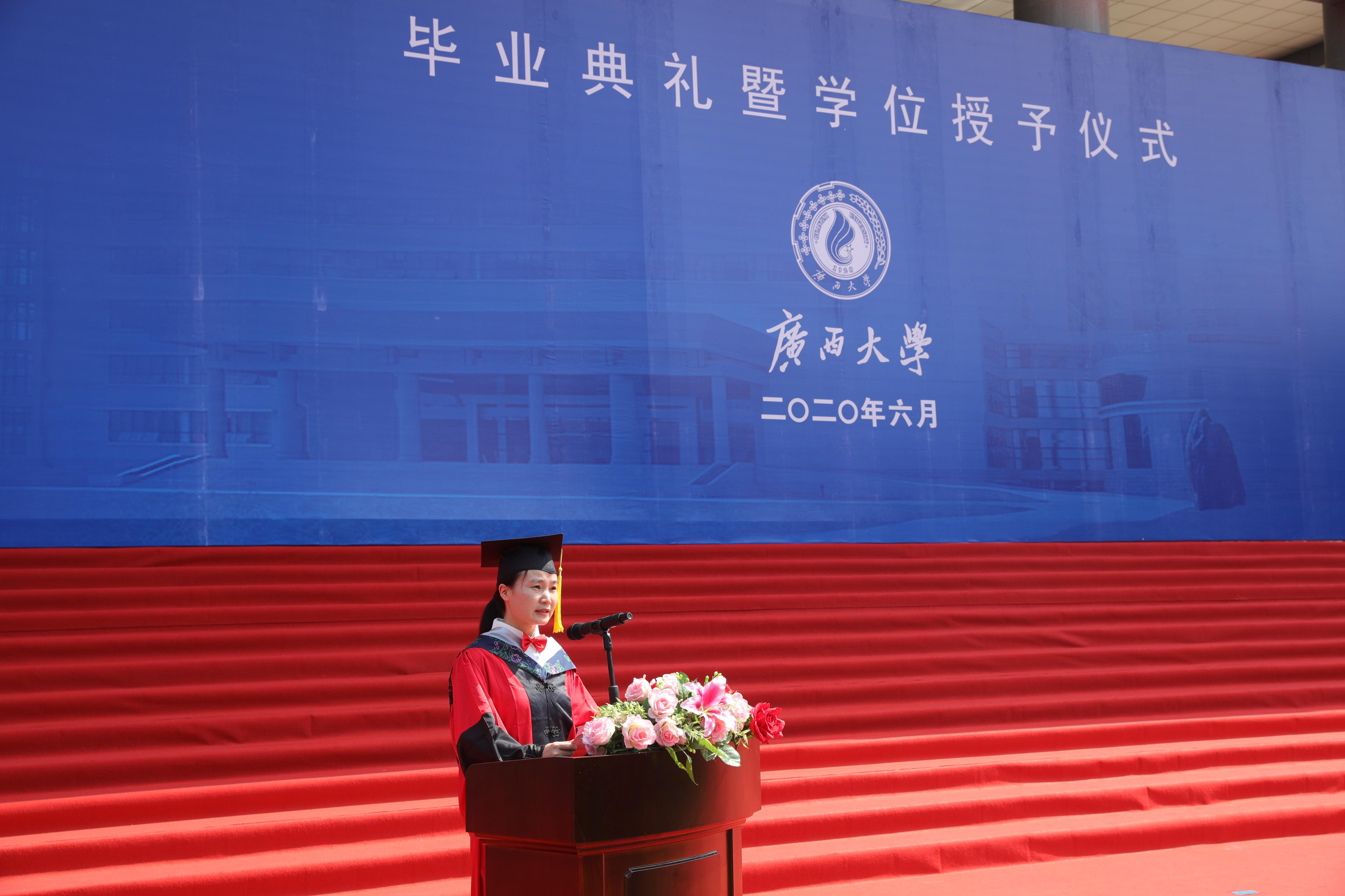 这场充满着清新气息的毕业典礼暨学位授予仪式,为严格疫情防控之下的毕业季增添了一份浓浓的惜别情绪,注定让我院学子们对校园生活留下独特的记忆,终生难忘。上午9时,典礼在庄严的国歌中拉开帷幕,院党委书记莫柏林对毕业生们表示祝贺,勉励同学们以抗疫一线的优秀校友为榜样,具有家国担当,勤学向善,砥砺前行,获得生活和事业上的成功;教师代表申佩弘教授感谢同学们在最美好的青春年华与老师们并肩作战度过了难忘时光,告诉毕业生,不论同学们将来遇到怎么样的难险阻或是灿烂辉煌,母校和老师永远是大家的支持与鼓励;家长代表陆美莲女士和毕业生代表李欣颖回顾了同学们求学中的点点滴滴,对学校、学院的培养和老师们的教导表达了感激之情,祝愿母校和学院发展越来越好,祝愿老师们工作顺利、阖家安康。最后,学院学位评定分委员会委员组成的导师团为毕业生拨穗、授予毕业证书和学位证书,仪式在老师、同学们共同唱响的《广西大学校歌》歌声中落下帷幕。