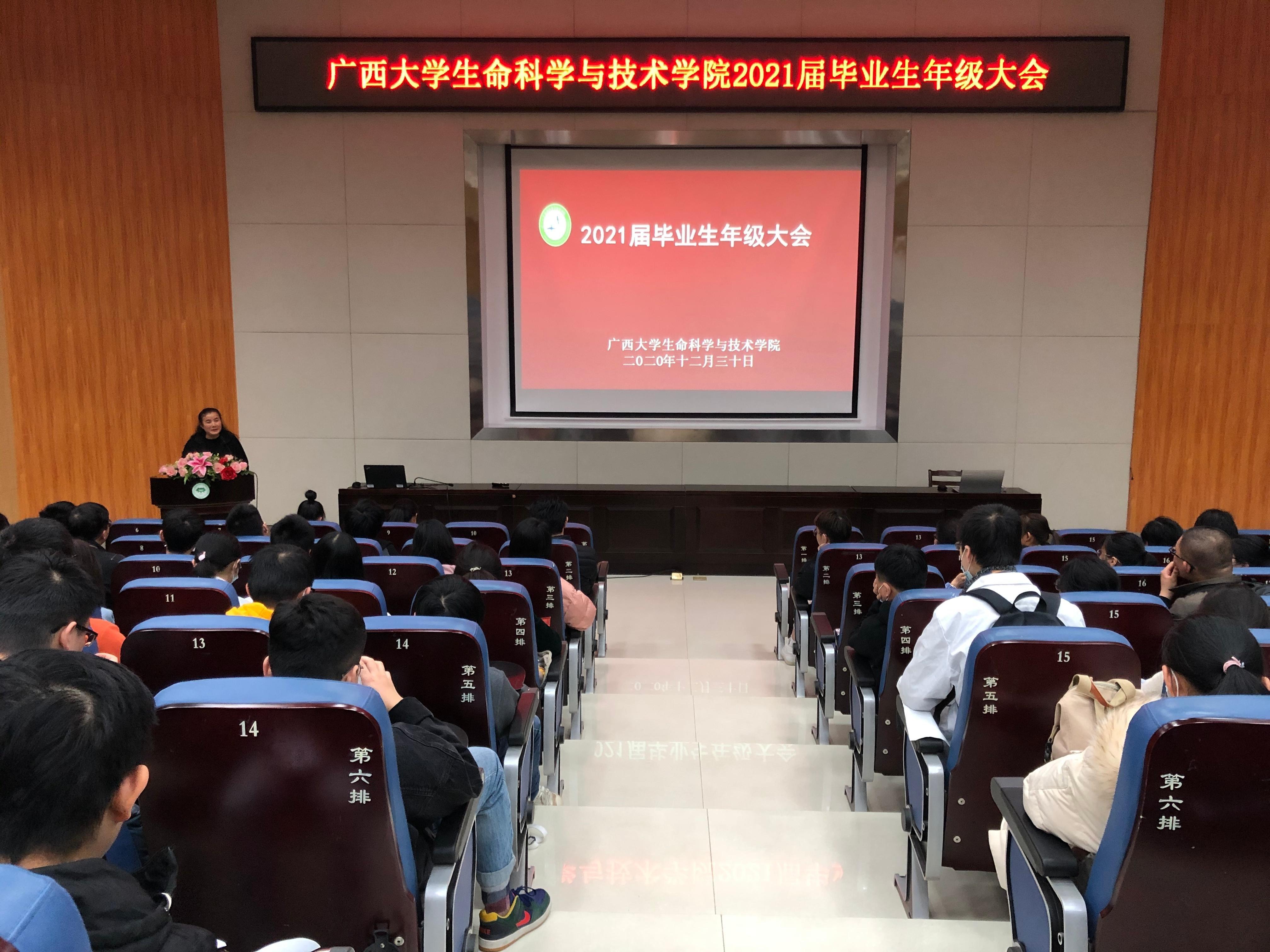 2020年12月30日下午,生命科学与技术学院2021届毕业生大会在学院报告厅举行。学院党委副书记曾海艳老师、学工组全体老师以及即将毕业的全体2021届博士研究生、硕士研究生及本科生参加本次大会。曾海艳副书记在会上围绕就业情况、疫情对就业影响、如何应对影响以及对毕业生的要求四方面对毕业生就业进行了动员。