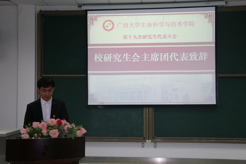 接着,校研究生会主席团代表任庆肖、动物科学与技术学院主席团代表杨安琪分别上台致词,表达了他们对本次学生代表大会的竞选者寄予厚望,以及对本次活动取得圆满成功的殷切希望。