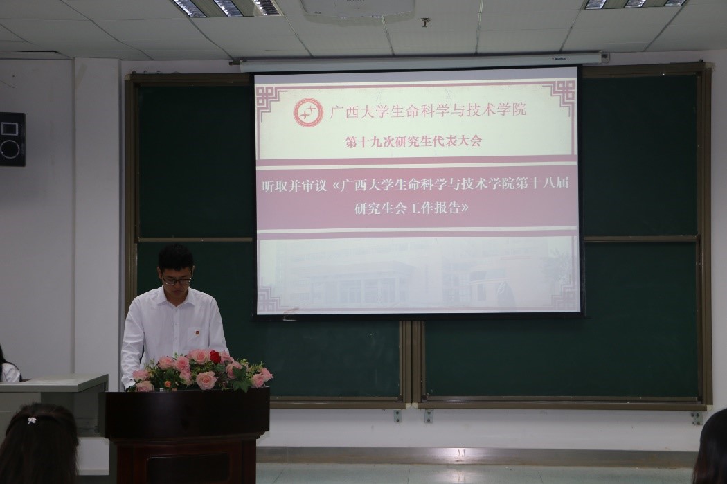 曾海艳老师讲话结束后,会议进入第二阶段。我院第十八届研究生会主席邹赫威作题为“不忘初心、牢记使命 ,做时代弄潮儿;团结合作 ,继往开来 ,创生科新华章”的工作报告,回顾了我院研究生会取得的成果与存在的不足,并对未来进行了规划与展望。