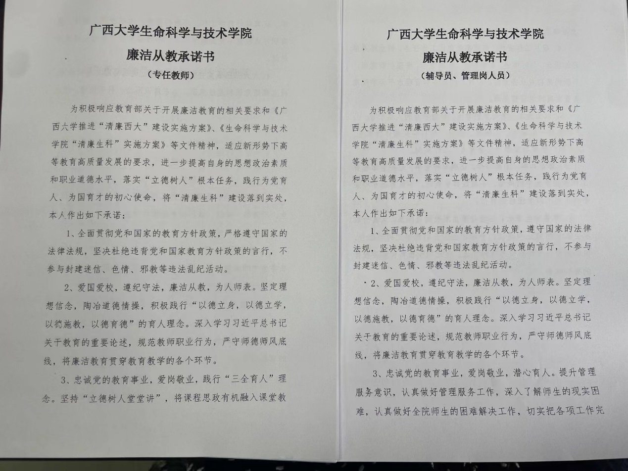 为积极响应教育部关于开展廉洁教育的相关要求和《广西大学推进“清廉西大”建设实施方案》、《生命科学与技术学院“清廉生科”实施方案》等文件精神,11月22日,我院组织全院教师在学院106开展以“廉洁从教”为主题的师德师风承诺签名活动。
