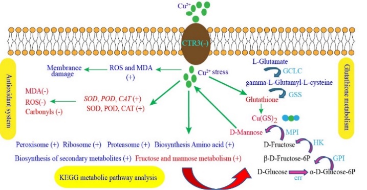研究团队通过全基因组学,转录组学,代谢组学整合分析揭示了GXDK6的铜耐受机制(图2)。全基因组分析结果显示,9个基因即(CCC2、CTR3、FRE2、GGT、GST、CAT、SOD2、PXMP4和HSP82)与GXDK6铜耐受性相关。转录组学分析结果表明,在铜胁迫下,谷胱甘肽代谢相关基因表达上调,谷胱甘肽含量和谷胱甘肽硫转移酶活性提高,表明细胞中铜的结合和铜解毒能力增强。铜转运蛋白Ctr3抑制铜吸收和Ccc2增强铜泵出细胞,细胞内铜浓度降低。抗氧化酶基因(PXMP4、SOD2和CAT)表达上调,抗氧化酶酶活性也随之提高,降低了铜诱导的活性氧产生、蛋白质羰基化、膜脂过氧化和细胞死亡,从而提高细胞在铜胁迫下的生存率。代谢组学分析结果表明GXDK6在铜胁迫下,能积累大量D-甘露糖,外源添加D-甘露糖实验验证D-甘露糖有利于提高GXDK6铜耐受性。该研究有助于了解M. guilliermondii的铜耐受机制,及将其运用于食品发酵过程中去除铜奠定理论基础(Frontiers in Microbiology. 2021.12: 771878)。