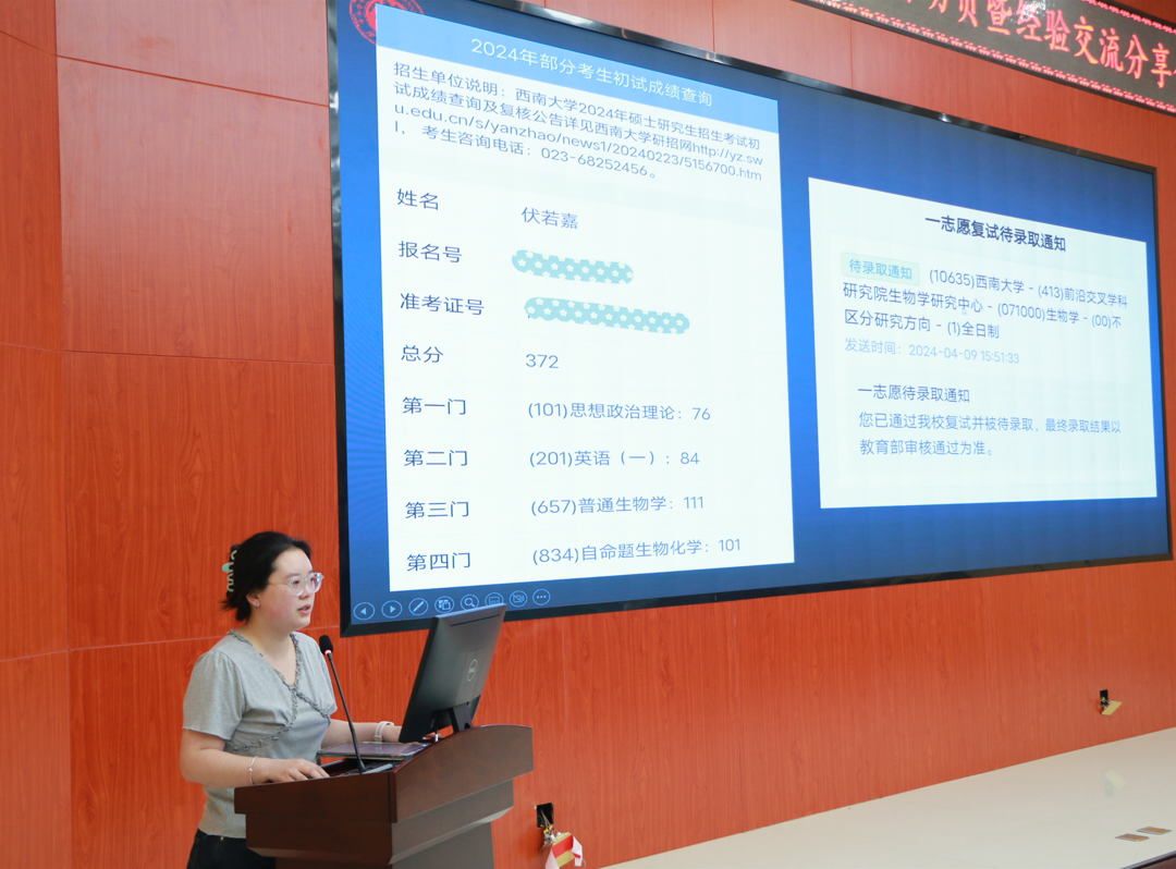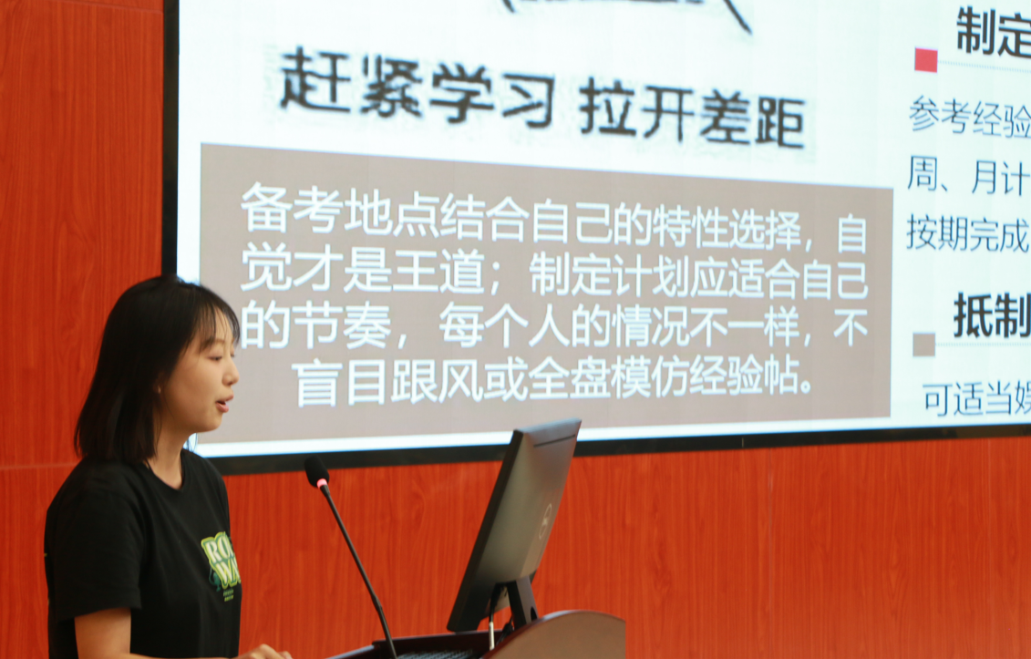 杨金月同学分享了自己获取目标院系考研信息和备考资料的途径,勉励同学们在备考过程中要耐得住寂寞,自律自省,坚定自信,尽量阻断外界,抵制短视频、游戏的诱惑。