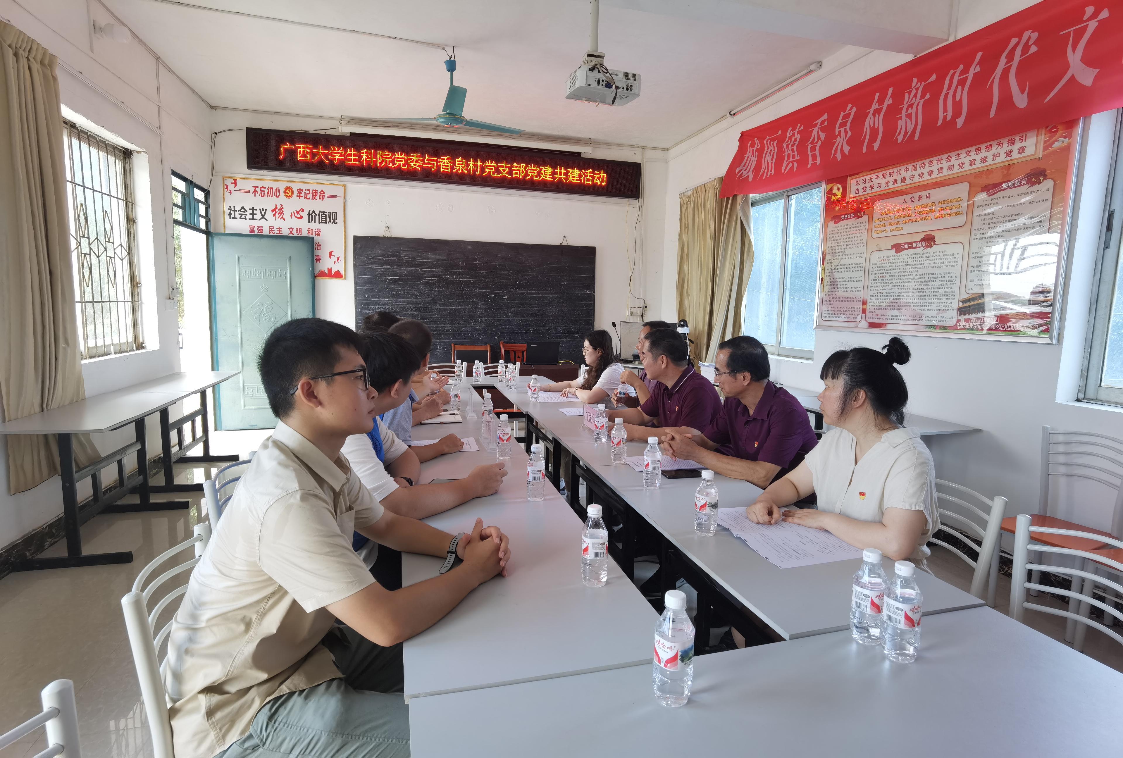 在城厢镇领导和香泉村驻村第一书记带领下,学院党委一行参观了村容村貌,实地考察了木瓜、甘蔗、水果基地等乡村产业发展情况。在村委会议室,学院党委和香泉村党支部就党的建设、红色如何引领绿色发展、如何巩固拓展脱贫攻坚成果同乡村振兴有效衔接等方面进行了交流探讨,提出了专业性指导和可行性建议。院党委书记莫柏林表示,通过结对共建活动,充分发挥基层党组织的核心引领作用,构建结对帮带、双向促进、共同提高的基层党建工作新格局。同时,还能不断加强在校大学生的耕读教育,弘扬中国农耕文化,厚植知农爱农情怀,勇担强农兴农使命 。