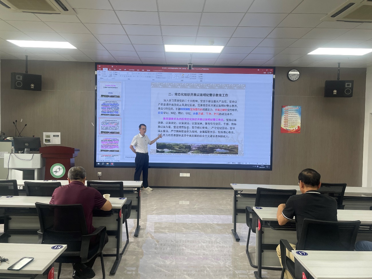 会上,学院党委书记黄开勇以《严守党纪国法坚守清正廉洁》为题作警示教育讲话,强调指出:全面从严治党永远在路上、党的自我革命永远在路上,我们党必须持之以恒推进全面从严治党、必须全面强化正风肃纪反腐工作。各级党组织要常态化组织开展警示教育,坚持以案说德、以案说纪、以案说法、以案说责,教育引导党员干部持续锤炼坚如磐石的抵腐定力,自觉学纪知纪明纪守纪,永葆忠诚干净担当的政治本色。教工党员要以违纪违法案例为镜鉴,严守政治纪律和政治规矩,坚定理想信念、坚守初心使命,严守党纪国法、坚守清正廉洁,全面履职尽责、坚持潜心教育,争做有理想信念、有道德情操、有扎实学识、有仁爱之心的好老师,当好学生成长成才的引路人,着力培养德智体美劳全面发展的社会主义建设者和接班人。