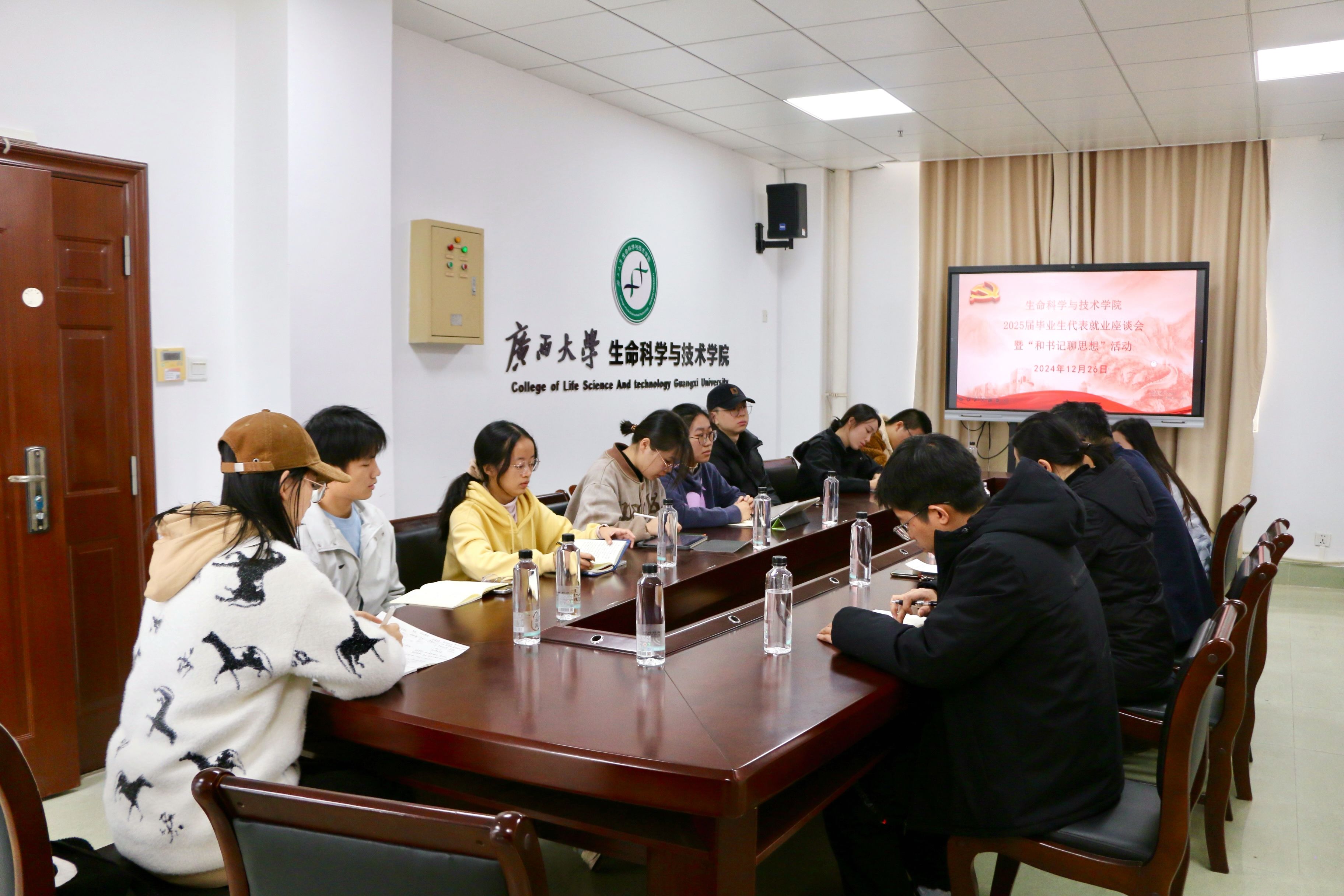 12月26日上午,我院在201室召开“和书记聊思想”主题活动暨2025届毕业生代表就业座谈会。学院党委书记刘培军,团委书记马奕,学工组辅导员贺超以及我院2025届毕业生代表参加座谈。座谈会由学院党委副书记、纪委书记覃文月主持。