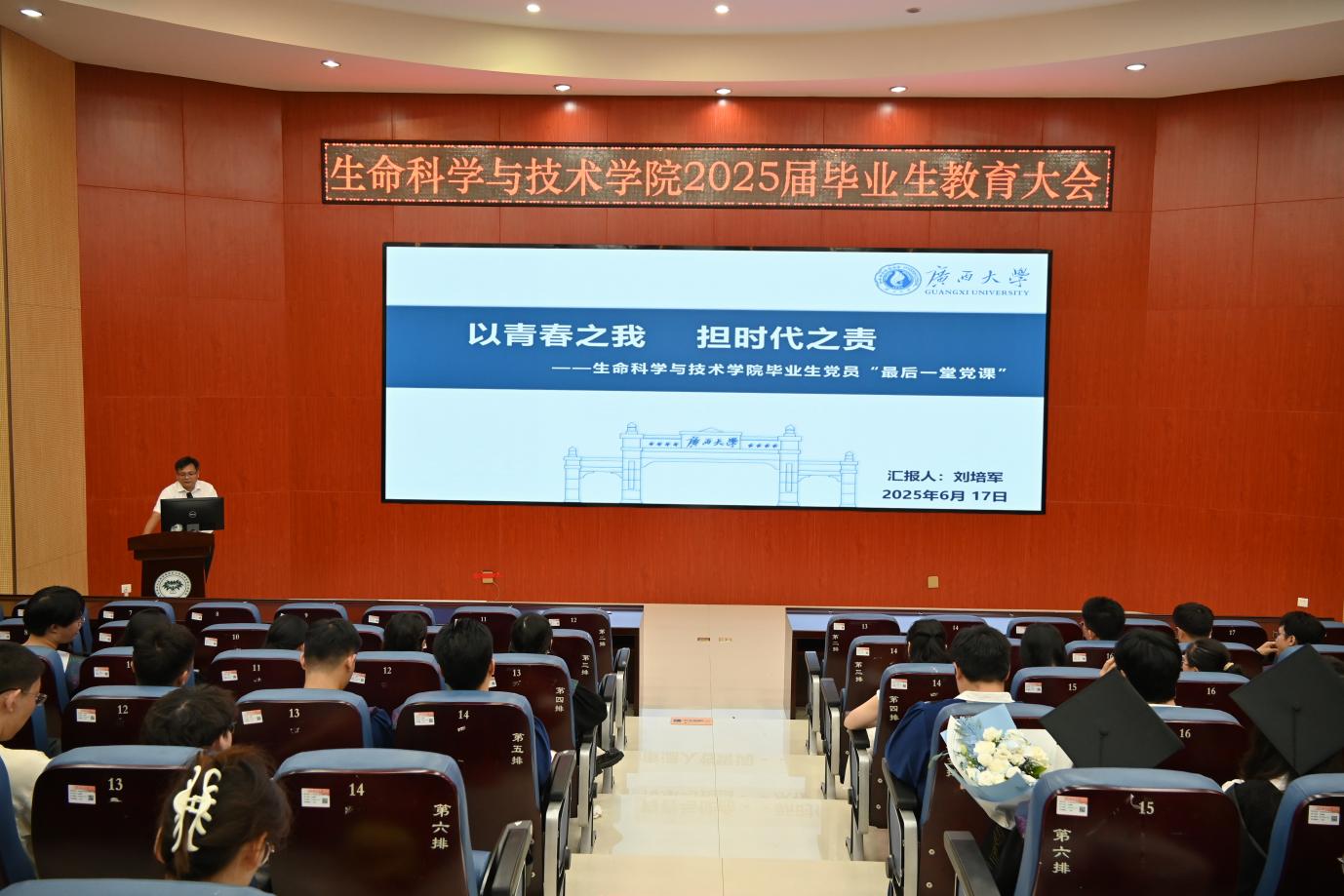 刘培军书记以“以青春之我担时代之责”为题,为2025届毕业生上“最后一次党课”。课上,刘书记从“青春与使命”、“传承与担当”、“重温入党誓词”三个方面,深刻阐释了新时代青年的使命与担当。他结合实际,通过列举夏爱群校友赴四川阿坝藏区基层工作并成长为县委干部、广西大学生在美丽乡村建设中带动小学生参与环保监督、都安高中校长莫振高资助学生、张桂梅校长创办女子高中的故事,勉励广大生科学子牢记初心使命,在健康中国建设、生物医药研发、粮食安全等领域展现担当作为;通过剖析干部违纪案例,教育引导毕业生筑牢纪律防线。最后,在刘书记的带领下,全体党员重温了入党誓词。