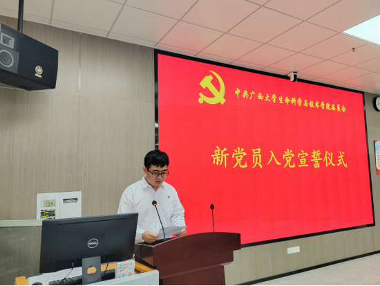 仪式在雄壮的《国歌》声中拉开序幕,韦世栋老师宣读新党员名单。随后,刘培军书记领誓,全体新党员面向党旗,高举右拳庄严宣誓。洪亮坚定的誓言,彰显着对党忠诚的承诺、对党的事业的信念,也是未来行动的准则。